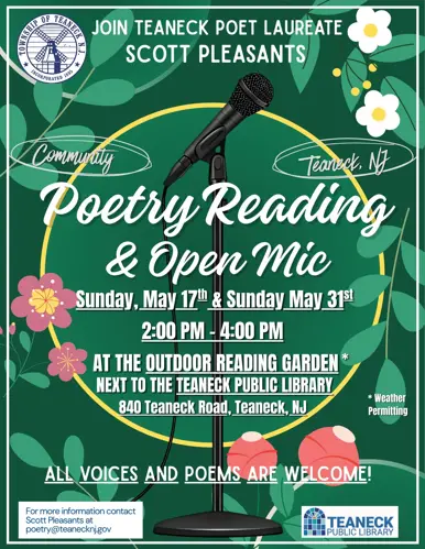 Weather permitting, join the Poet Laureate for a Poetry Reading and Open Mic at the outdoor reading garden next to the Teaneck Library on Sunday May 17 and May 31 from 2-4pm.