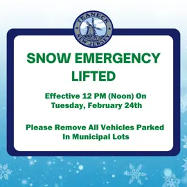 The Snow Emergency will be lifted at 12PM (2/24). Vehicles can then park on public streets without snow emergency restrictions. Please remove all vehicles from municipal lots!