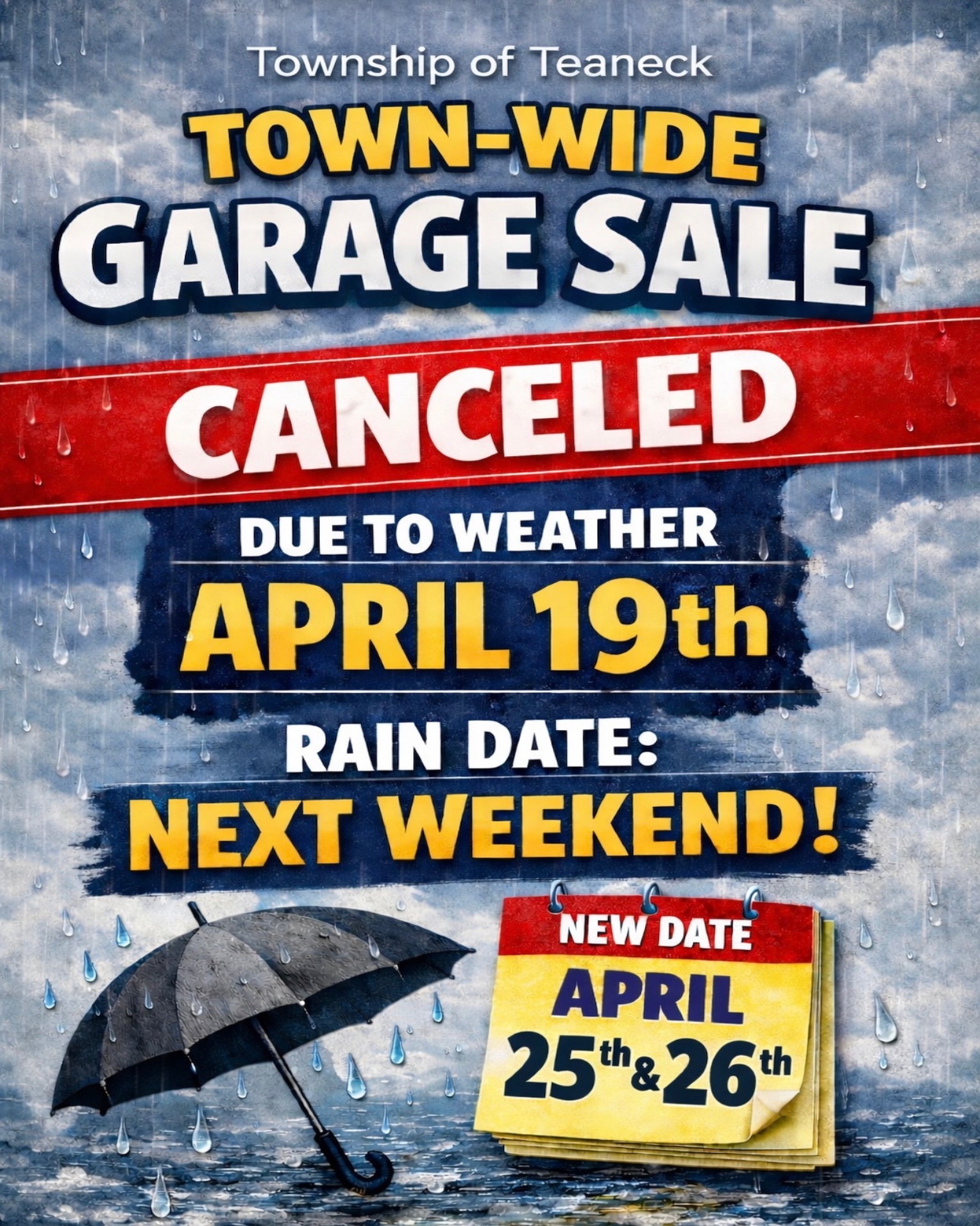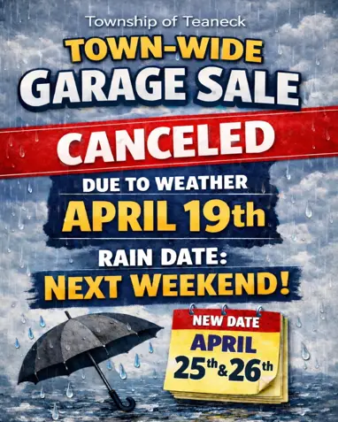 Due to expected rain on April 19th, 2026, the Teaneck Town-Wide Garage Sale will be postponed until the rain date of April 25th & 26th!!!