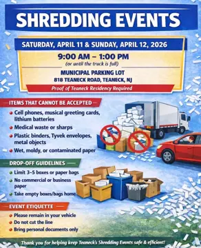 Proof of residency required. ONLY PERSONAL PAPER and DOCUMENTS. Anything non-paper will be turned away. Wet/contaminated paper will be turned away. LIMIT 3-5boxes or paper bags. Empty boxes and bags go home with you.