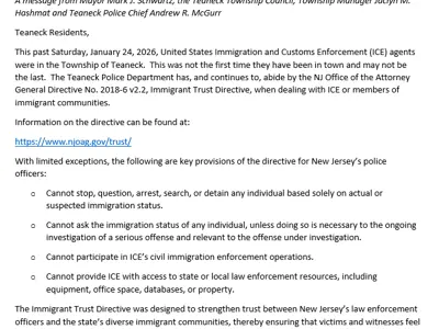 This past Saturday, January 24, 2026, United States Immigration and Customs Enforcement (ICE) agents were in the Township of Teaneck. This was not the first time they have been in town and may not be the last. The Teaneck Police Department has, and continues to, abide by the NJ Office of the Attorney General Directive No. 2018-6 v2.2, Immigrant Trust Directive, when dealing with ICE or members of immigrant communities.