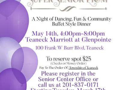 Registration begins Tuesday, March 17 at the Senior Center Office, or call 201-837-0171. $25/reservation. 1 Reservation per person. Check or Money Order. Must be a TEANECK Resident!
