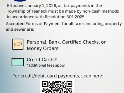 Effective January 1, 2026, all tax payments in the Township of Teaneck must be made by non-cash methods in accordance with Resolution 301-2025.