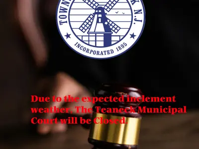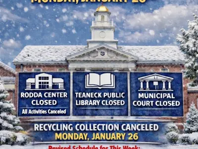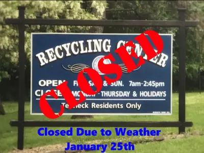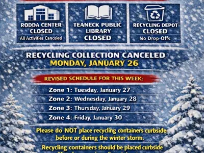 Please note that on Sunday January 25th, the Rodda Center, Teaneck Public Library and Recycling Depot will be closed in anticipation of the upcoming winter storm. Curbside recycling collection will not be picked up on Monday January 26th and is rescheduled. Municipal Court sessions on the 26th are also canceled.