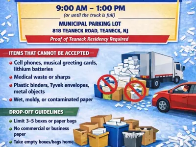 Proof of residency required. ONLY PERSONAL PAPER and DOCUMENTS. Anything non-paper will be turned away. Wet/contaminated paper will be turned away. LIMIT 3-5boxes or paper bags. Empty boxes and bags go home with you.