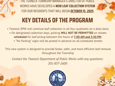 There is no change to the existing process with leaf collection scheduled in all 4 quadrants daily. The change will be that Emergency NO PARKING regulations will be posted for designated streets 48 hours in advance. No Parking restrictions will be in full effect so residents will be subject to warning & ticketing. This trial system is designed to provide faster, safer, and more efficient leaf removal throughout the Township.