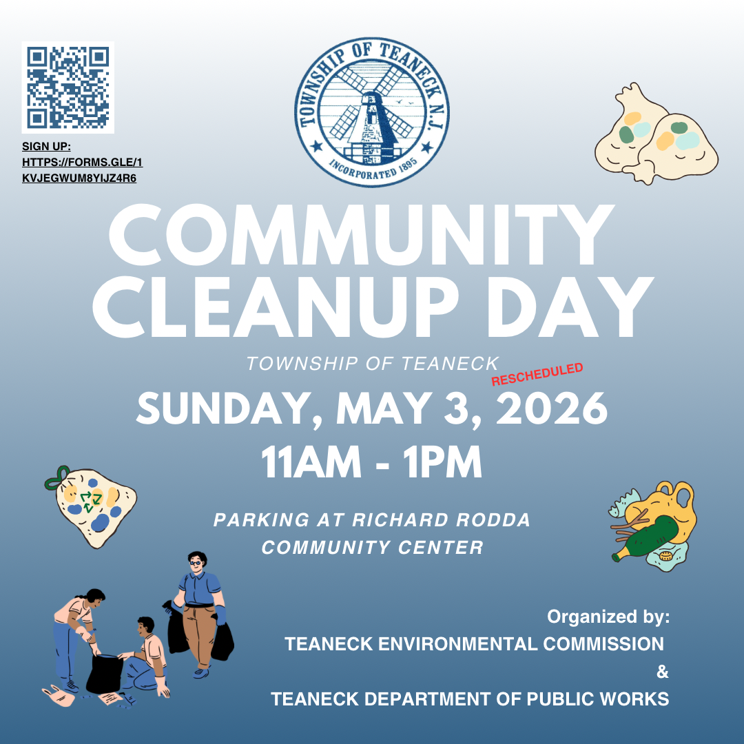If you signed up already and are still interested in participating on May 3rd you do not need to re-register. If you have not registered and are available on May 3rd, sign up here: Teaneck Town Cleanup Signup - May 3, 2026