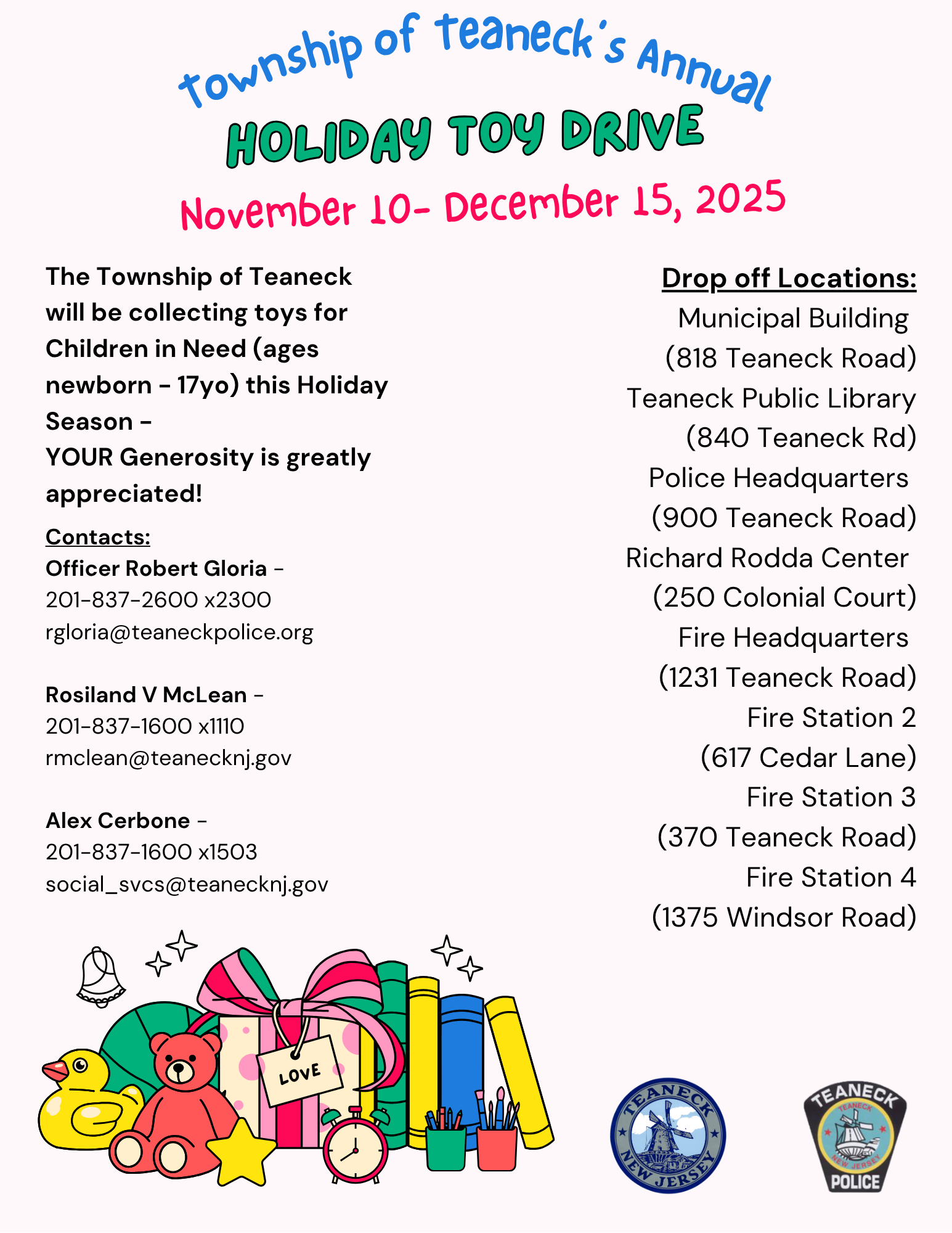 The Township of Teaneck will be collecting toys for Children in Need (ages newborn - 17yo) this Holiday Season -