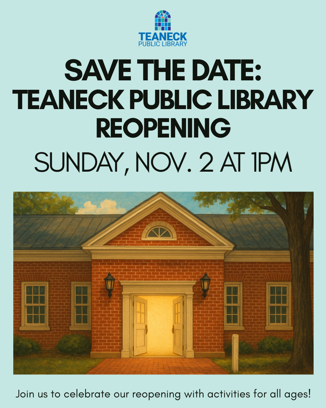 We’re thrilled to announce the scheduled Reopening of Teaneck Public Library on Sunday, November 2 at 1pm!