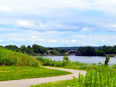 Overpeck County Park is made up of land donated from Teaneck, Englewood, Leonia, Palisades Park, and Ridgefield Park surrounding Overpeck Creek. It spans over 805 acres and features athletic tracks and fields, picnic and fishing areas, playgrounds, a canoe/kayak launch, an amphitheater, 5 miles of trails, and more.